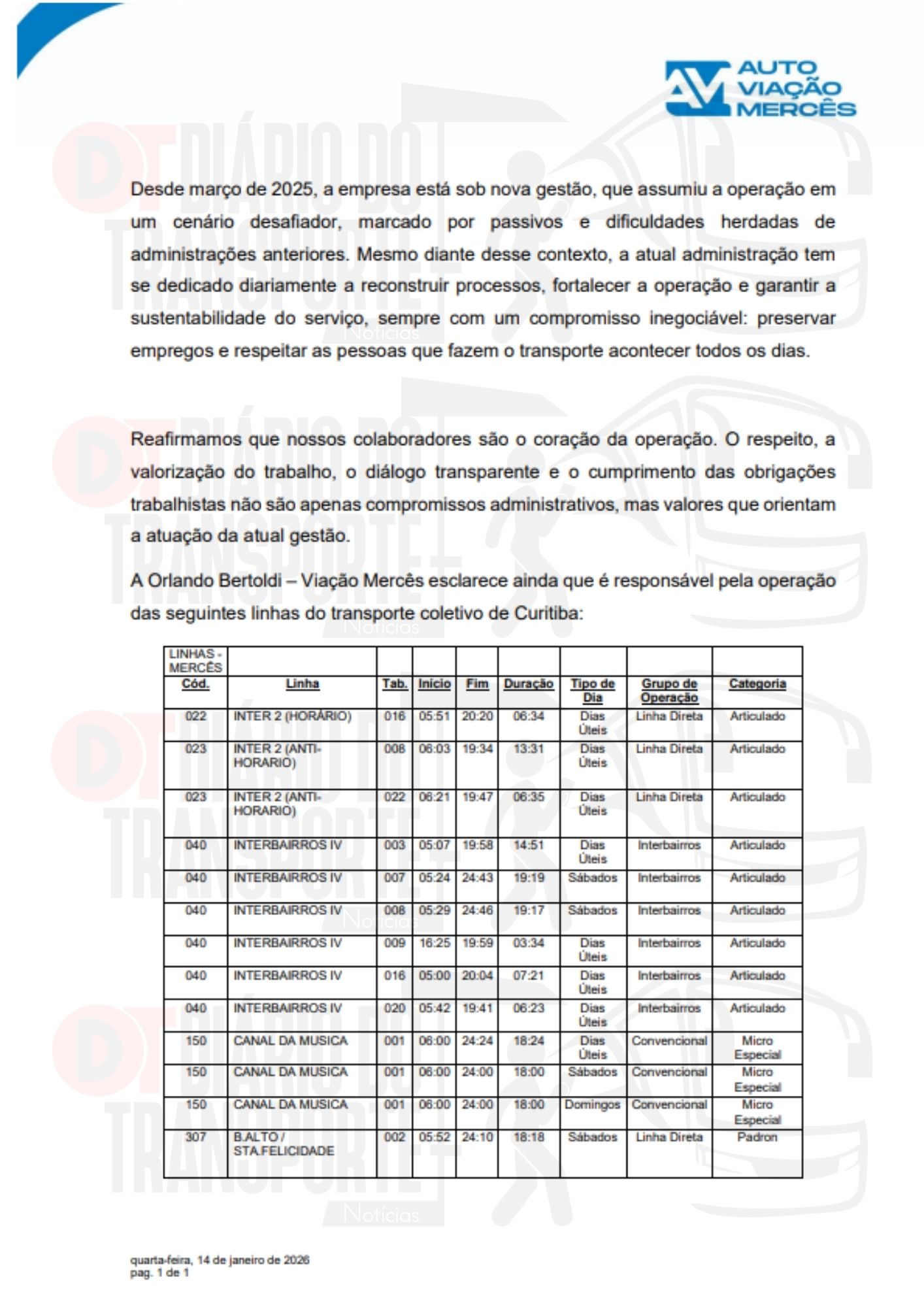 É importante destacar que a situação da Auto Viação Mercês é isolada e não representa o cenário do transporte coletivo de Curitiba como um todo, que segue operando normalmente, com regularidade e qualidade.
