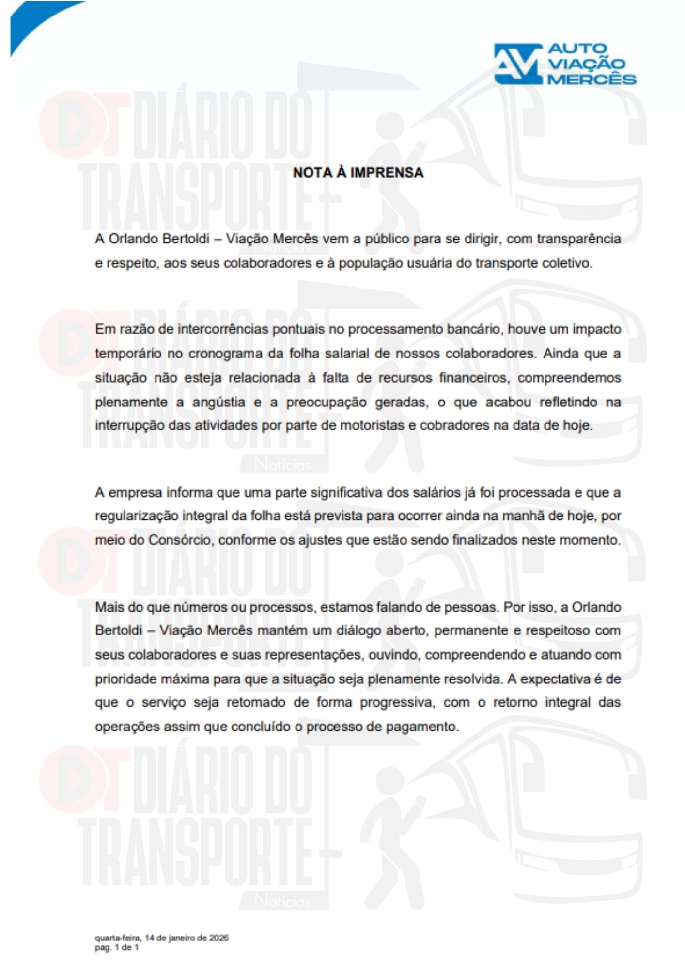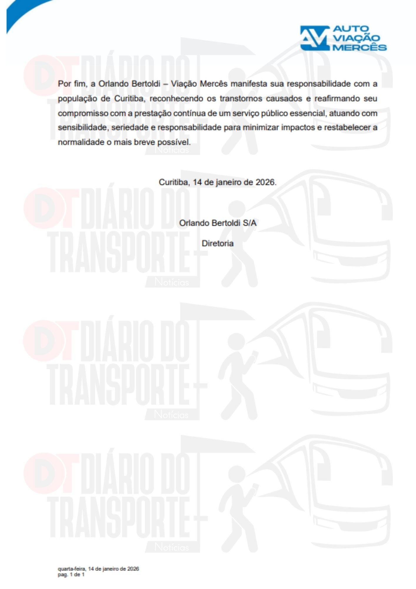 Por fim, a Orlando Bertoldi – Viação Mercês manifesta sua responsabilidade com a população de Curitiba, reconhecendo os transtornos causados e reafirmando seu compromisso com a prestação contínua de um serviço público essencial, atuando com sensibilidade, seriedade e responsabilidade para minimizar impactos e restabelecer a normalidade o mais breve possível.