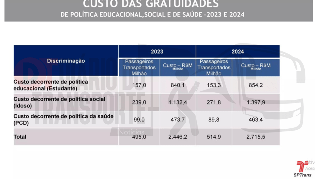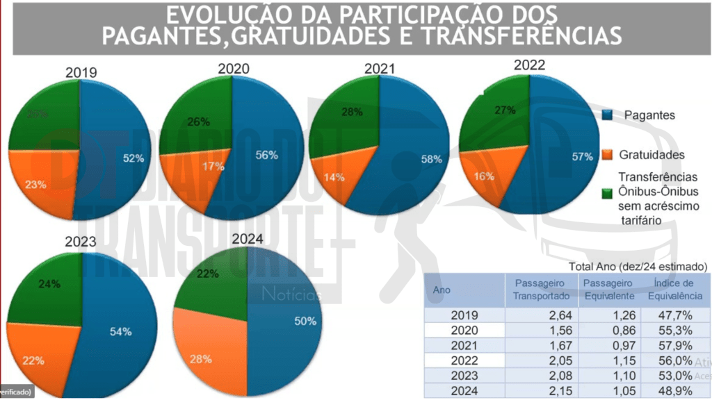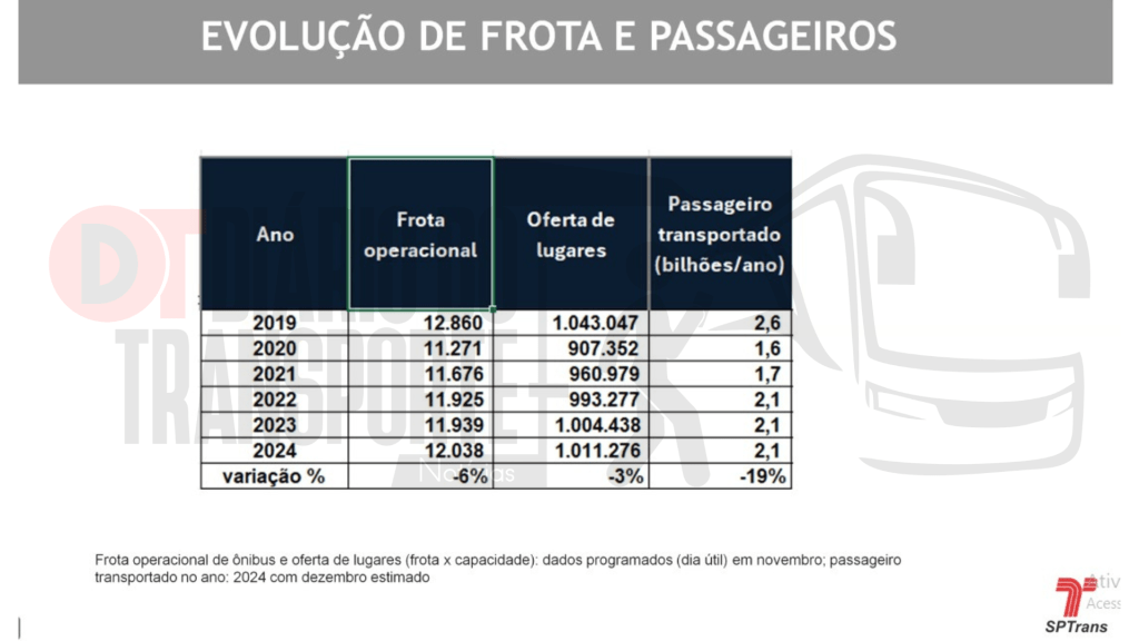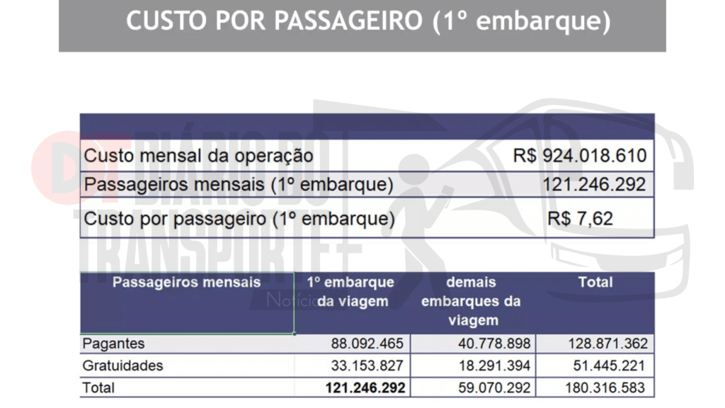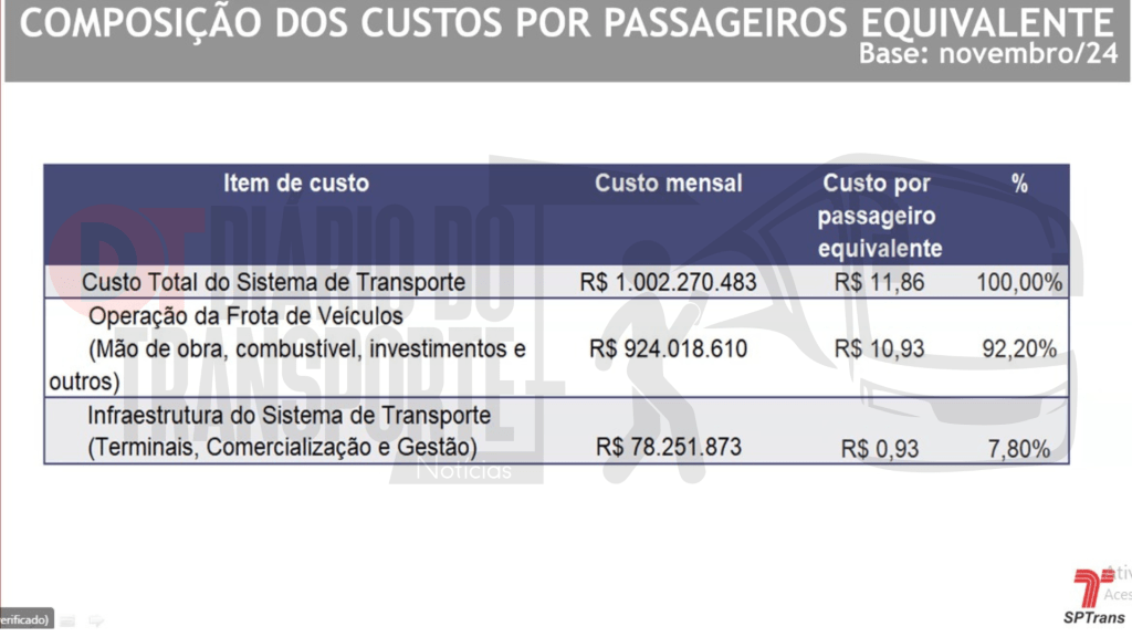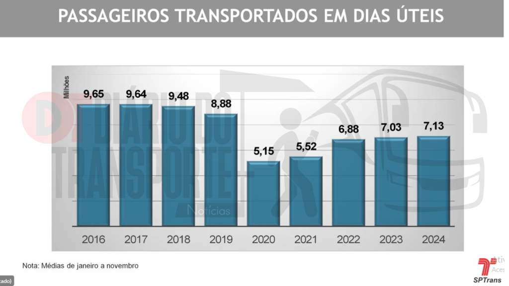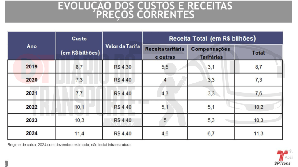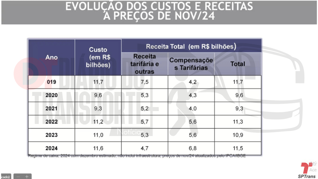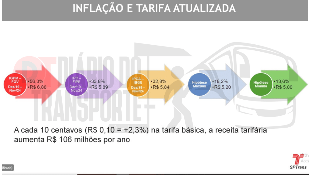 Eu reunião do CMTT (Conselho Municipal de Trânsito e Transporte), que ocorreu na manhã desta quinta-feira, 26 de dezembro de 2024 para debater os custos da prestação de serviços das linhas municipais gerenciadas pela SPTrans (São Paulo Transporte), a prefeitura mostrou a necessidade aumento da tarifa de ônibus em 2025. A hipótese de valor mínimo será de R$ 5 (alta de 13,6%) e a máxima será de R$ 5,20 (18,2%). A SPTrans informou que atualmente, em média, a quantidade de passageiros transportados em dias úteis pelos ônibus na cidade é de 7,1 milhões, cerca de 20% a menos que os 9,65 milhões de 2019. Atualmente, as gratuidades representam 28% da demanda, 22% de transferência gratuita ônibus para ônibus e 50% de passageiros pagantes. Ainda de acordo com a SPTrans, operam 94% da frota em comparação a antes de pandemia ante 80% da demanda. Desde janeiro deste ano de 2024, os valores cobrados pelos dois meios de transportes, que por anos foram os mesmos, são diferentes. O sistema de trilhos cobra dos passageiros atualmente R$ 5,00 e os ônibus geridos pela SPTrans (São Paulo Transporte), na capital paulista têm tarifa de R$ 4,40 desde janeiro de 2020. Trens e metrôs tiveram tarifas congeladas entre 2020 e 2023. Os custos de operação de transportes subiram em 2024 e, como adiantou o Diário do Transporte, a elevação dos valores do óleo diesel foram um dos principais pontos abordados na reunião. Os custos totais apresentados foram de R$ 11,4 bilhões para 2024. Em 2020, eram de R$ 9,6 bilhões. Pelos custos atuais do sistema de ônibus, sem subsídios, a tarifa seria de R$ 11,86. Se todos os passageiros pagassem, o valor da tarifa seria de R$ 7,86, ou seja, sem subsídios e sem gratuidades, de acordo com a apresentação. O Diário do Transporte apurou que gestão Ricardo Nunes estuda se será possível, mesmo com aumento em 2025, continuar mantendo a tarifa de ônibus em São Paulo em valores inferiores ao que deve ser praticado pelo sistema de trem e metrô da região metropolitana, que também deve ter reajuste em janeiro. A possibilidade de os ônibus continuarem cobrando menos, mesmo com aumento, é só um estudo ainda. Não está descarta ainda totalmente a hipótese de os dois modais voltarem a ter mesmas tarifas.