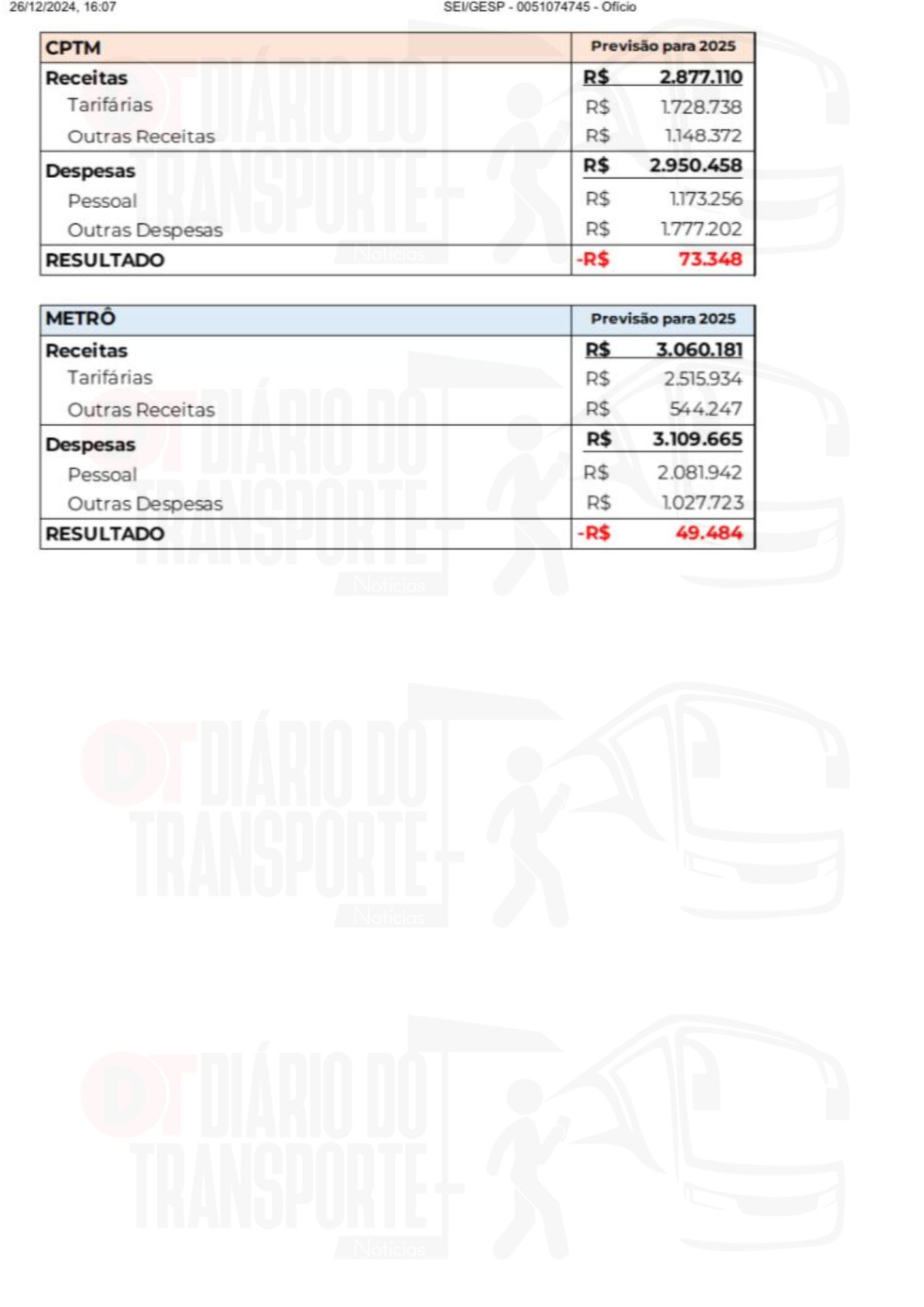 Em mensagem à Alesp (Assembleia Legislativa do Estado de São Paulo), a gestão do Governador Tarcísio de Freitas detalhou as novas tarifas do sistema metroferroviário e das integrações entre ônibus de diferentes cidades e trilhos na região metropolitana que entram em vigor a partir de 06 de janeiro de 2025.