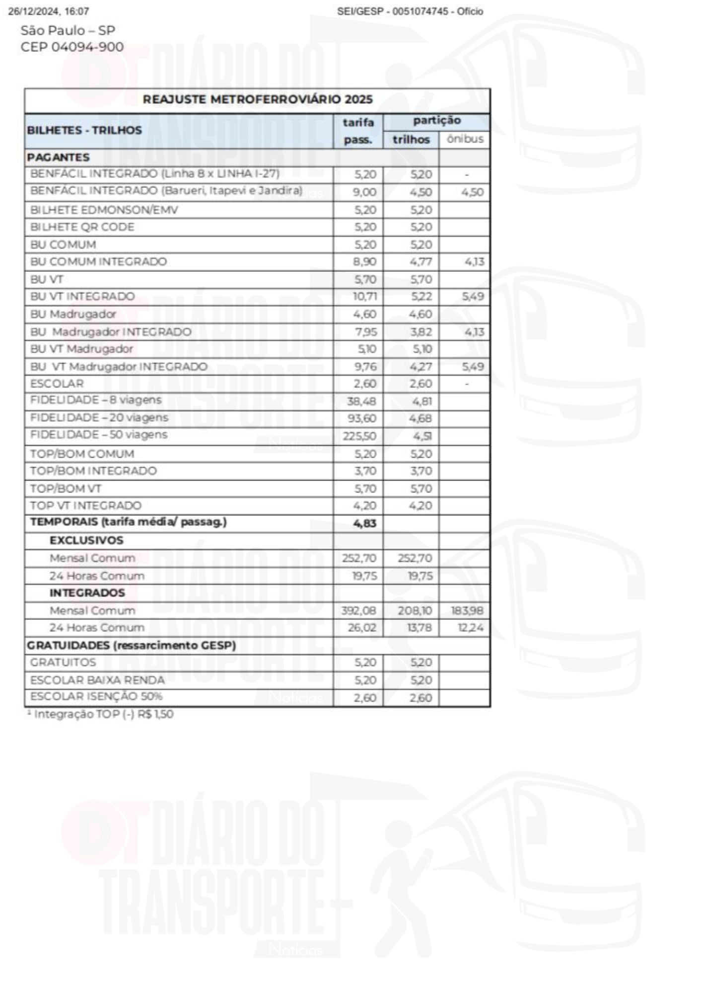 Vale-Transporte dos Trilhos irá para R$ 5,70 a partir de 06 de janeiro de 2025 e tarifa comum para R$ 5,20. Integração com ônibus pelo em Jandira, Barueri e Itapevi com valores definidos Em mensagem a Alesp (Assembleia Legislativa do Estado de São Paulo), a gestão do Governador Tarcísio de Freitas detalhou as novas tarifas do sistema metroferroviário e das integrações entre ônibus de diferentes cidades e trilhos na região metropolitana que entram em vigor a partir de 06 de janeiro de 2025. *Vale-Transporte* A tarifa do Vale-Transporte, paga pelos empregadores aos funcionários, passará para R$ 5,70 nos trens e metrô pelo Cartão TOP. A tarifa comum será de R$ 5,20. Há vários anos, o Vale-Transporte é mais caro que a modalidade comum. No caso dos ônibus da capital paulista, gerenciados pela SPTrans (São Paulo Transporte), enquanto a tarifa comum vai para R$ 5, a do Vale-Transporte será de R$ 5,49 a partir de 06 de janeiro de 2025. O Governo do Estado também publicou os novos valores de *integrações entre ônibus e trilhos em cidades como São Paulo Jandira, Barueri e Itapevi*. *São Paulo*: Pelo Bilhete Único, usar SPTrans e trilhos vai passar para R$ 8,90 na modalidade comum e R$ 10,71 pelo Vale-Transporte *Jandira, Barueri e Itapevi*: Já pelo Cartão BENFÁCIL, em Jandira, Barueri e Itapevi, a integração entre os ônibus da Benfica e o trem passará para R$ 9,00 na modalidade e, no caso da integração entre a linha 8-Diamante, operada pela ViaMobilidade, e a linha I-27 (Estação Cimenrita / Estação Amador Bueno), de ônibus da Benfica, o valor será de R$ 5,20. *Madrugador*: A Tarifa do Madrugador, para quem usa o sistema de trilhos passará de R$ 4,40 para R$ 4,60 na modalidade comum sem integração e para R$ 5,10 no Vale-Transporte. Para ter direito a Tarifa do Madrugador, basta acessar qualquer linha de metrô entre 4h40 e 6h15, utilizando Bilhete Único comum ou Vale Transporte. A Tarifa do Madrugador também é válida na rede de trens metropolitanos, entre 4h e 5h35. *Temporais e Fidelidade*: Também terão novos valores a partir de 06 de janeiro de 2025, as modalidades temporais do Cartão TOP, como Mensal e Comum, e o “Fidelidade”, quando o uso é exclusivo nos trilhos, com oito, 20 ou 50 viagens.