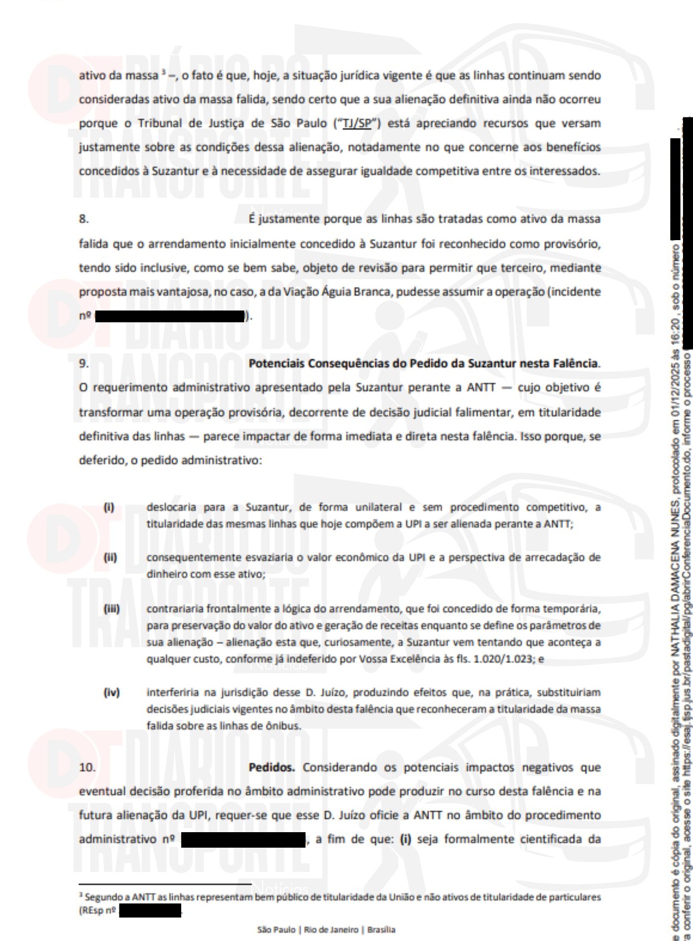 O requerimento administrativo apresentado pela Suzantur perante a ANTT — cujo objetivo é transformar uma operação provisória, decorrente de decisão judicial falimentar, em titularidade definitiva das linhas — parece impactar de forma imediata e direta nesta falência. Isso porque, se deferido, o pedido administrativo: