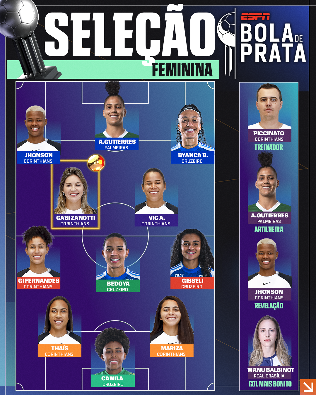 O Cruzeiro, vice-campeão brasileiro, também teve bem representado com quatro jogadoras na seleção Bola de Prata. O Palmeiras completou a equipe com a atacante Amanda Gutierres.