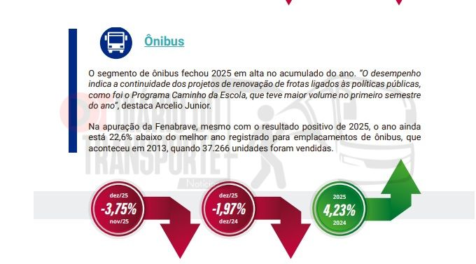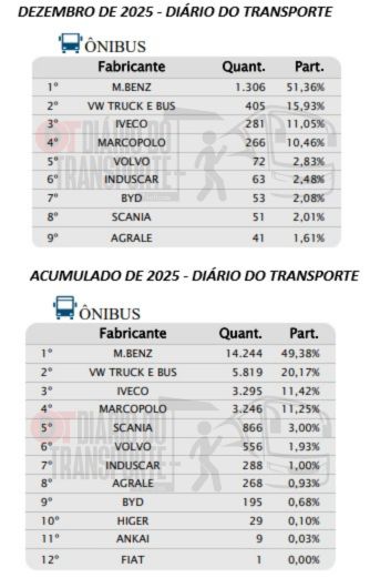 Ainda de acordo com o balanço consolidado, em dezembro de 2025, foram licenciados 2.543 ônibus, o que significa queda de 1,95% sobre 2.594 unidades de dezembro de 2024 e queda de 3,75% quando o comparativo for feito sobre os 2.642 ônibus registrados em novembro de 2025.
