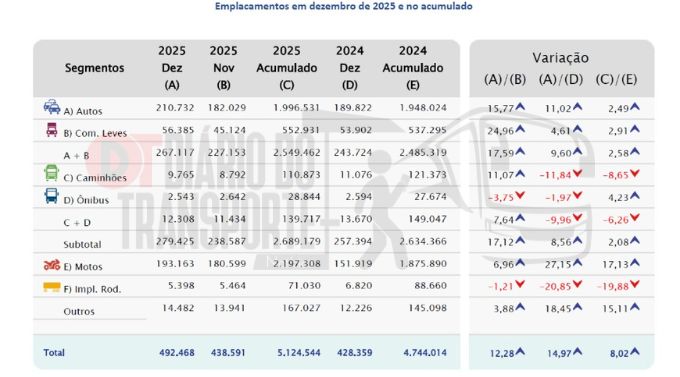 Considerando todos os tipos de veículos, entre motos, carros, comerciais leves, máquinas agrícolas, implementos rodoviários, caminhões e ônibus, segundo a Fenabrave, com 4 dias úteis a mais do que em 2024, o setor automotivo encerrou o ano de 2025, com 5,12 milhões (5.124.544) de unidades emplacadas, uma alta de 8,02% sobre o ano anterior. O crescimento geral, pouco maior do que o previsto pela entidade (7,2%), se deve ao desempenho do segmento das motocicletas, que bateram recorde histórico, com aumento de mais de 17%, atingindo 2,19 milhões ( 2.197.308) unidades vendidas no mercado interno.