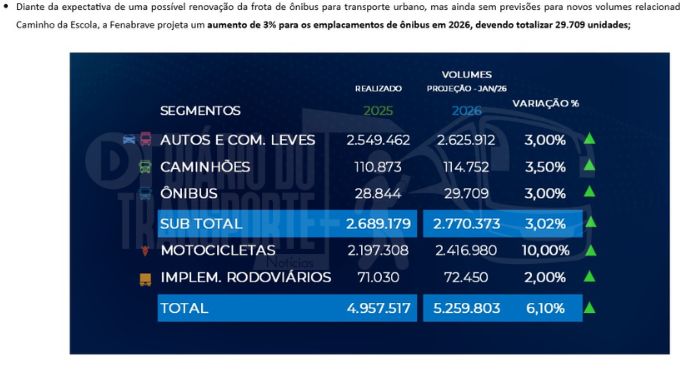 Segundo nota da Fenabrave, a projeção ainda não leva em conta os impactos de uma nova fase do Programa Caminho da Escola, de ônibus escolares do Governo Federal. Por ser ano eleitoral, o segmento de urbanos deve se destacar em 2026.