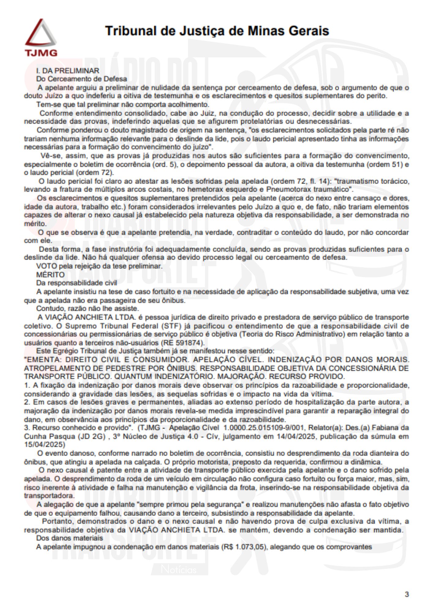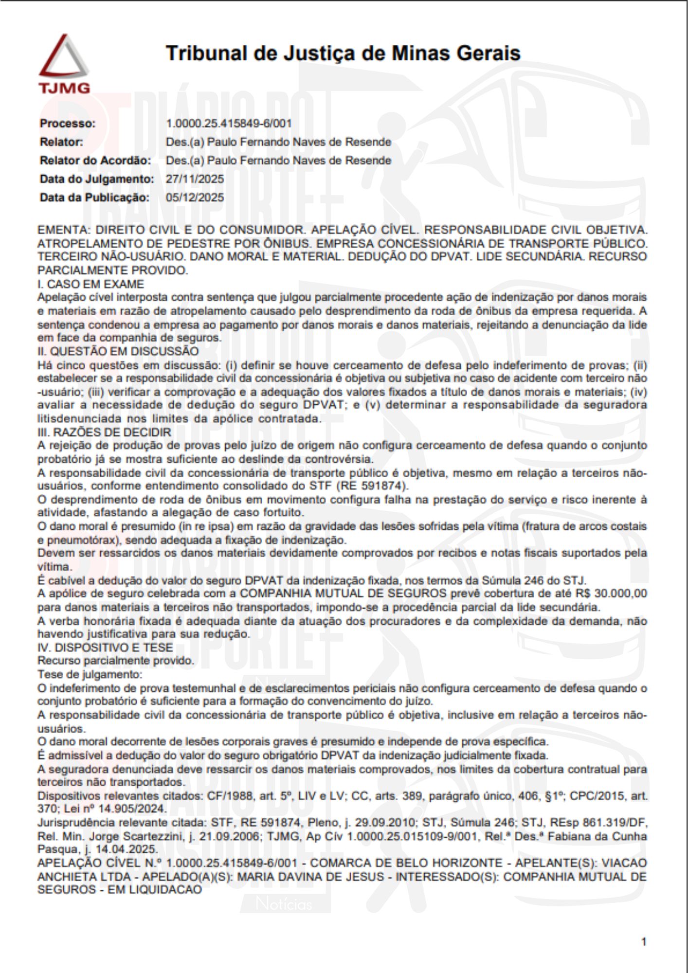 Segundo o TJMG (Tribunal de Justiça de Minas Gerais), o desembargador Paulo Fernando Naves de Resende, relator do caso, destacou que o Supremo Tribunal Federal (STF) já consolidou o entendimento de que a responsabilidade das concessionárias de transporte público é objetiva tanto para usuários quanto para terceiros. Isso significa que a empresa responde pelos danos causados a terceiros independentemente de culpa, bastando a comprovação do nexo entre a atividade exercida e o dano sofrido.