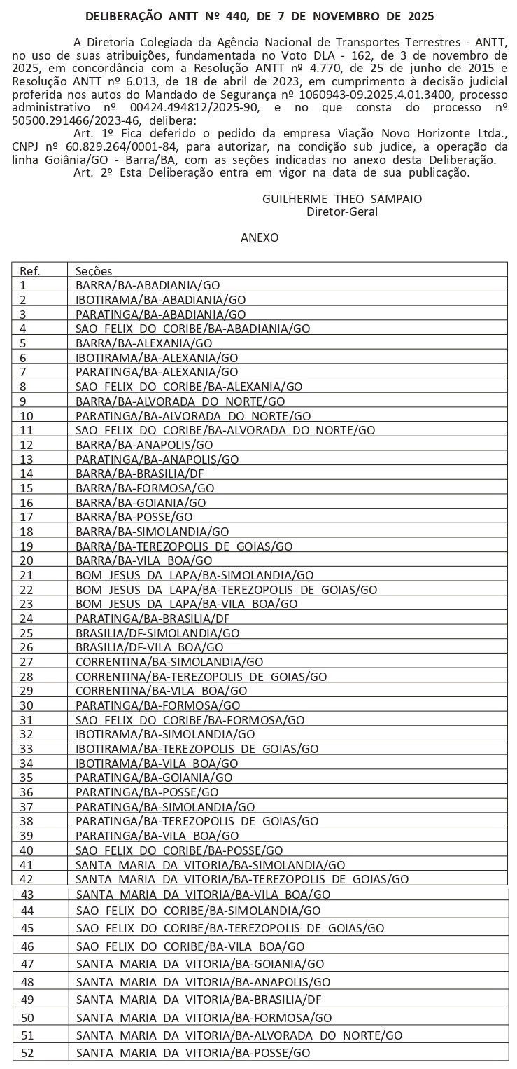 A Diretoria Colegiada da Agência Nacional de Transportes Terrestres (ANTT) publicou no Diário Oficial da União desta terça-feira, 11 de novembro de 2025, a Deliberação nº 440 que autoriza a Viação Novo Horizonte a operar, sob condição sub judice, a linha Goiânia (GO) – Barra (BA), com 52 seções intermediárias entre os estados de Bahia, Goiás e o Distrito Federal.