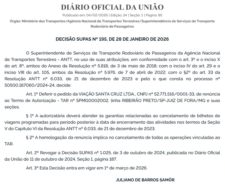 A Agência Nacional de Transportes Terrestres (ANTT) homologou a renúncia da Viação Santa Cruz ao Termo de Autorização (TAR) nº SPMG0002002, referente à linha Ribeirão Preto (SP) – Juiz de Fora (MG) e suas seções.