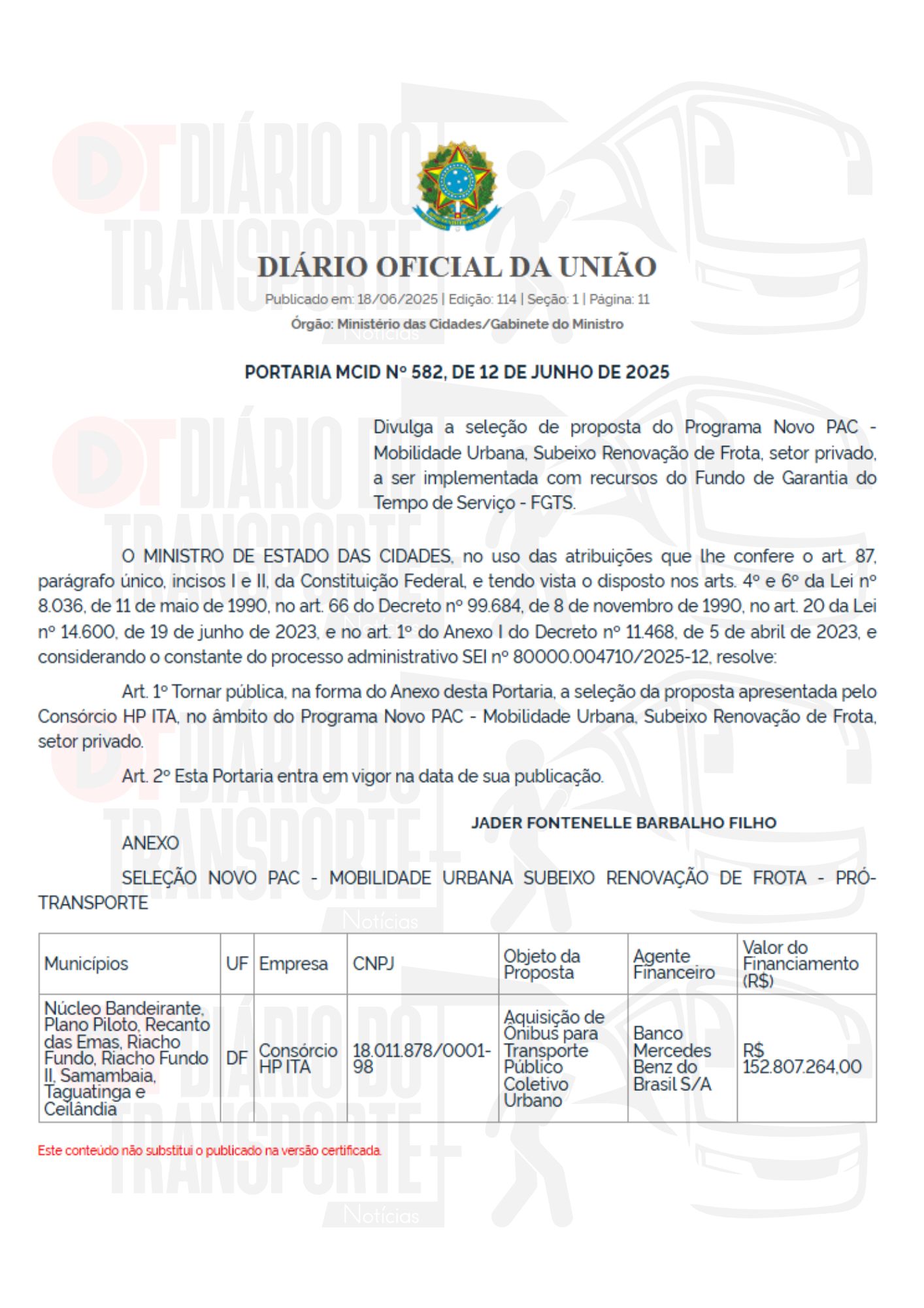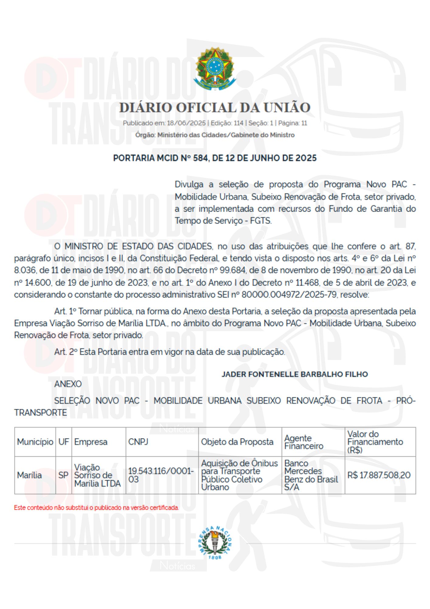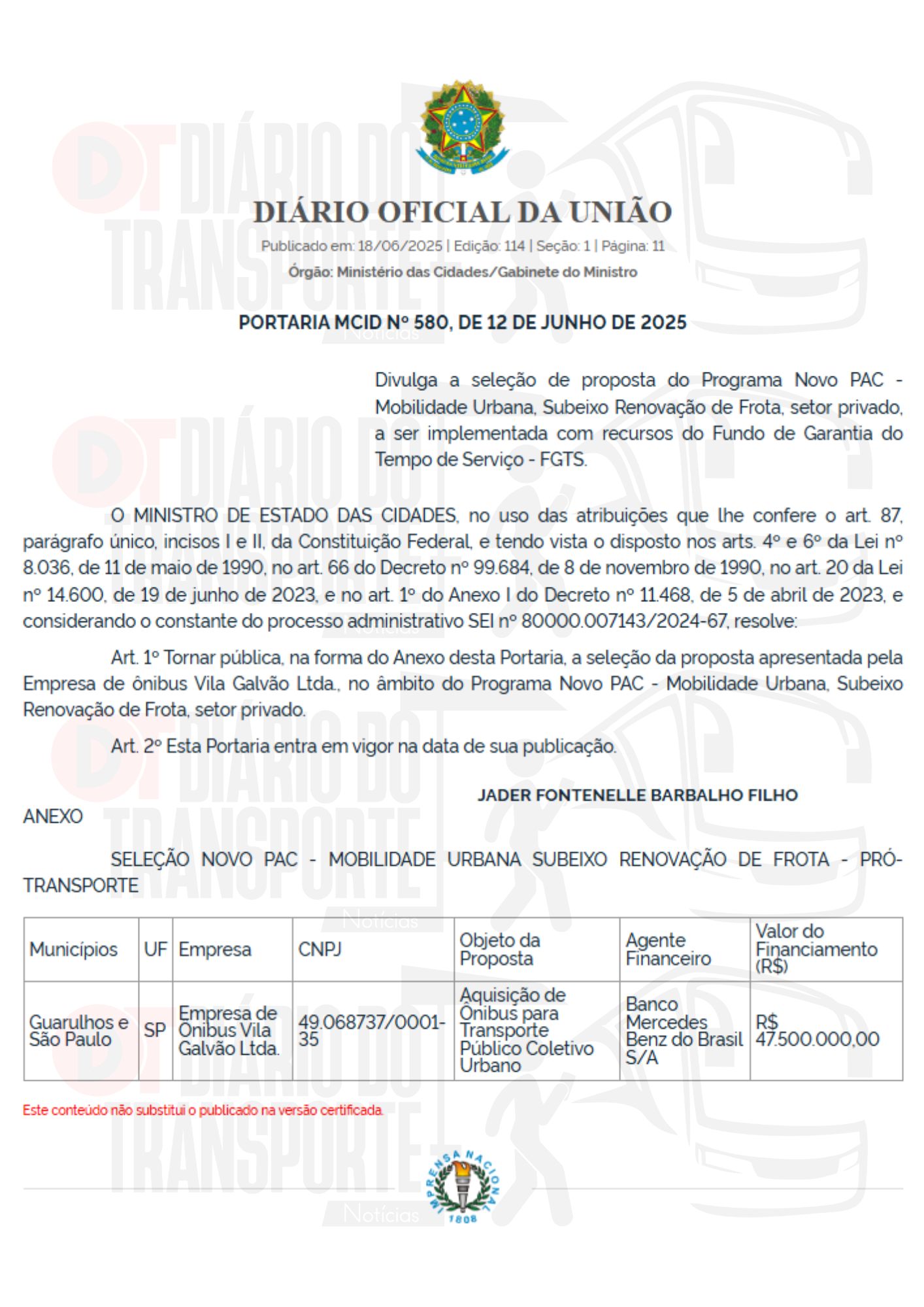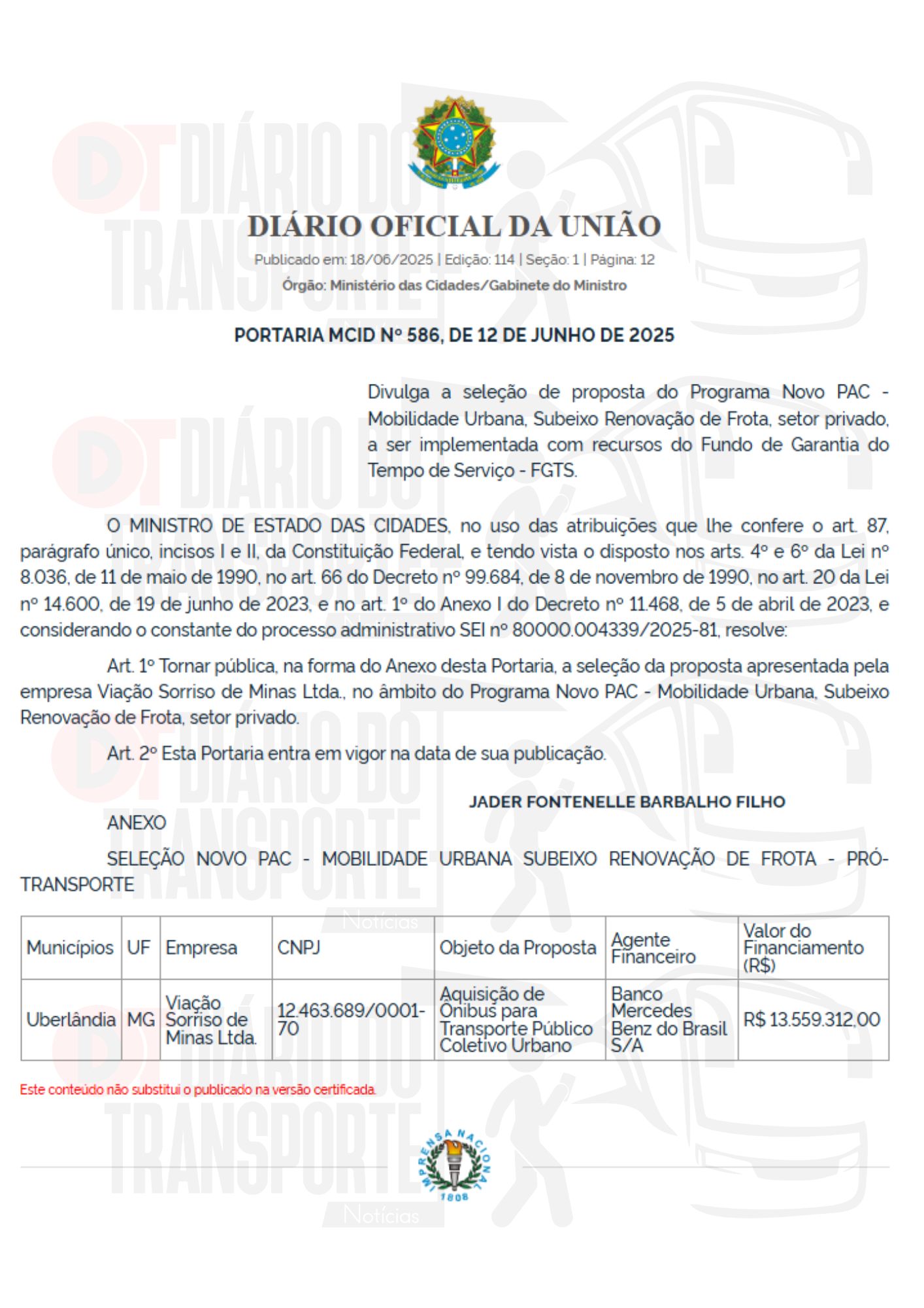 O Diário do Transporte acompanhou o processo e o desfecho de liberação de recursos.