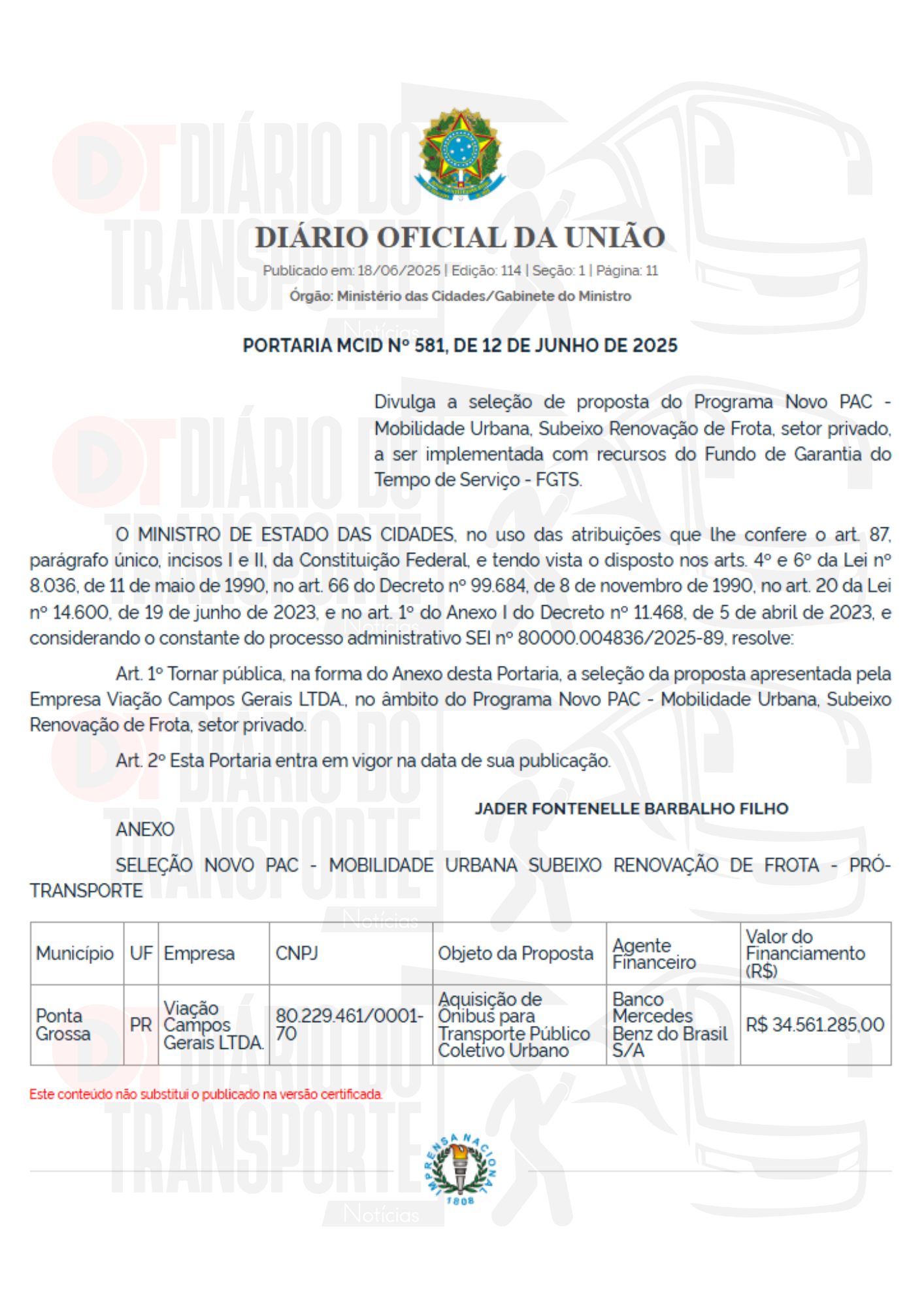 Ponta Grossa (PR) – Viação Campos Gerais LTDA. – R$ 34.561.285,00