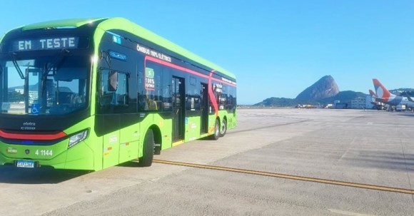 Em fevereiro desse ano, o e-Bus de 15m da Eletra com carroceria Caio e pack de baterias WEG fez seus primeiros testes no Aeroporto Santos Dumont. Foto: Divulgação Eletra.